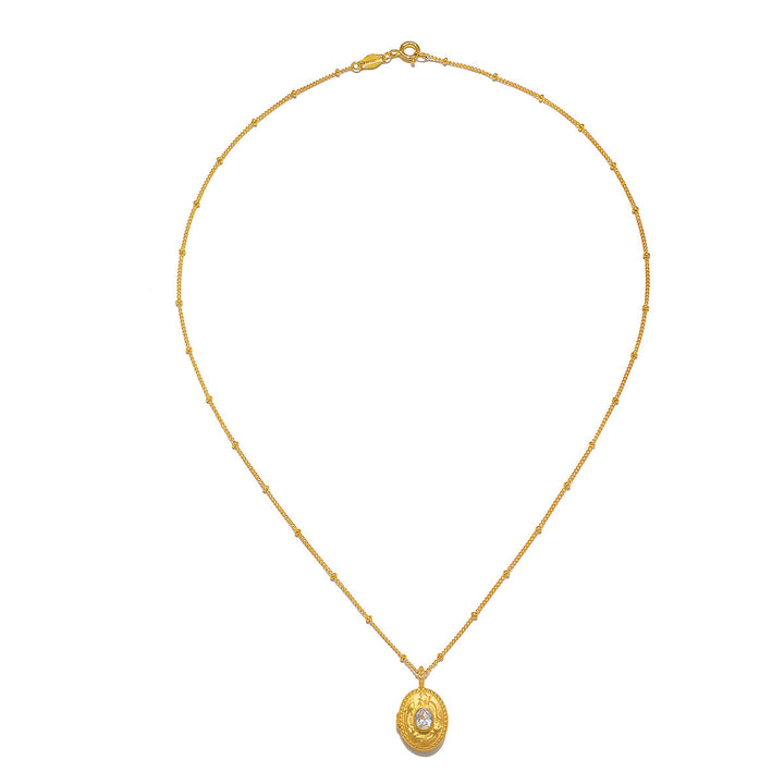 Made from 18kt gold plate over brass, the pendant measures 16 x 13mm and features a 4 x 5mm faceted white topaz stone. Necklace length is 18 inches.