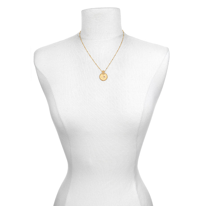 Made from 18kt gold plate over brass, the pendant measures 20mm. The necklace length is 18 inches.
