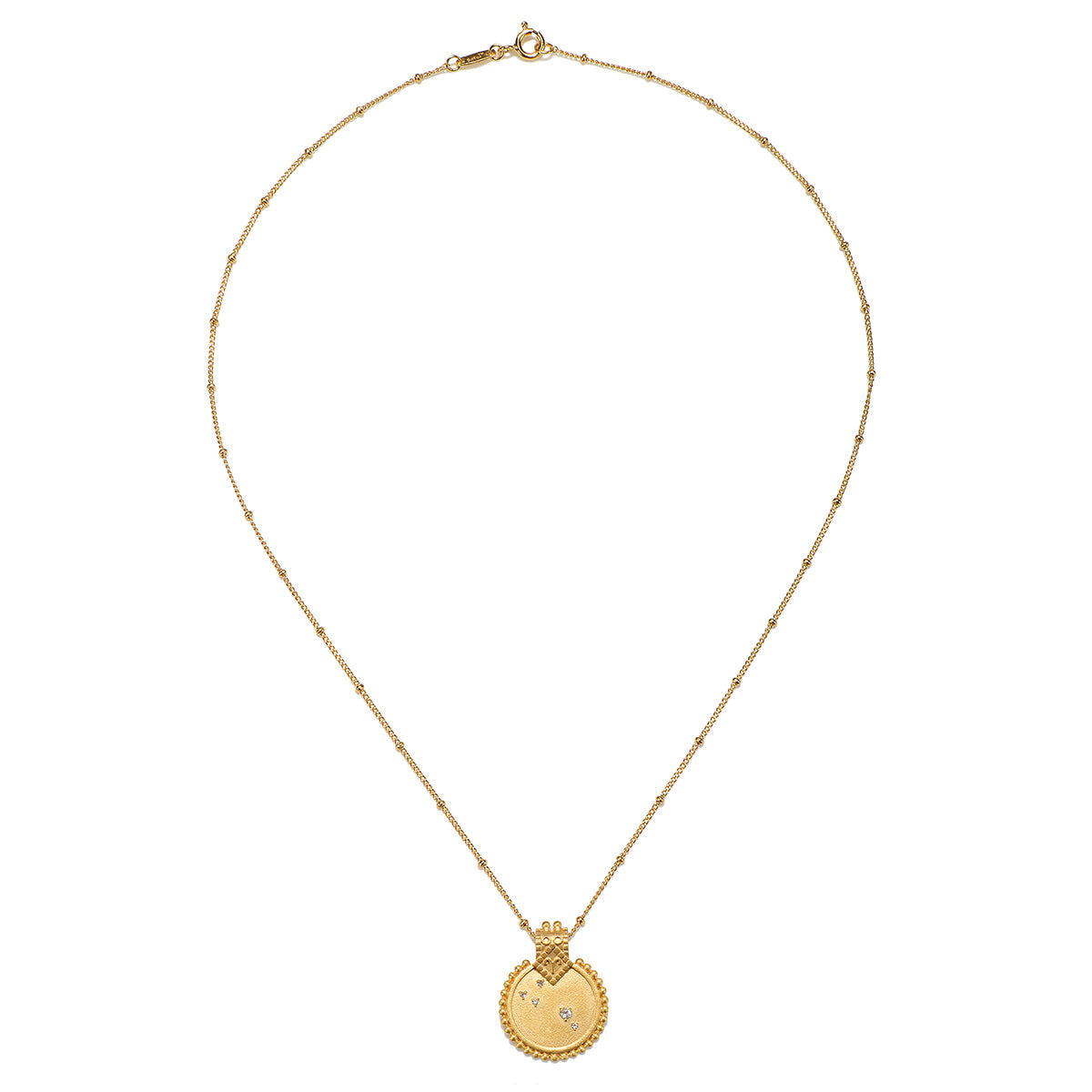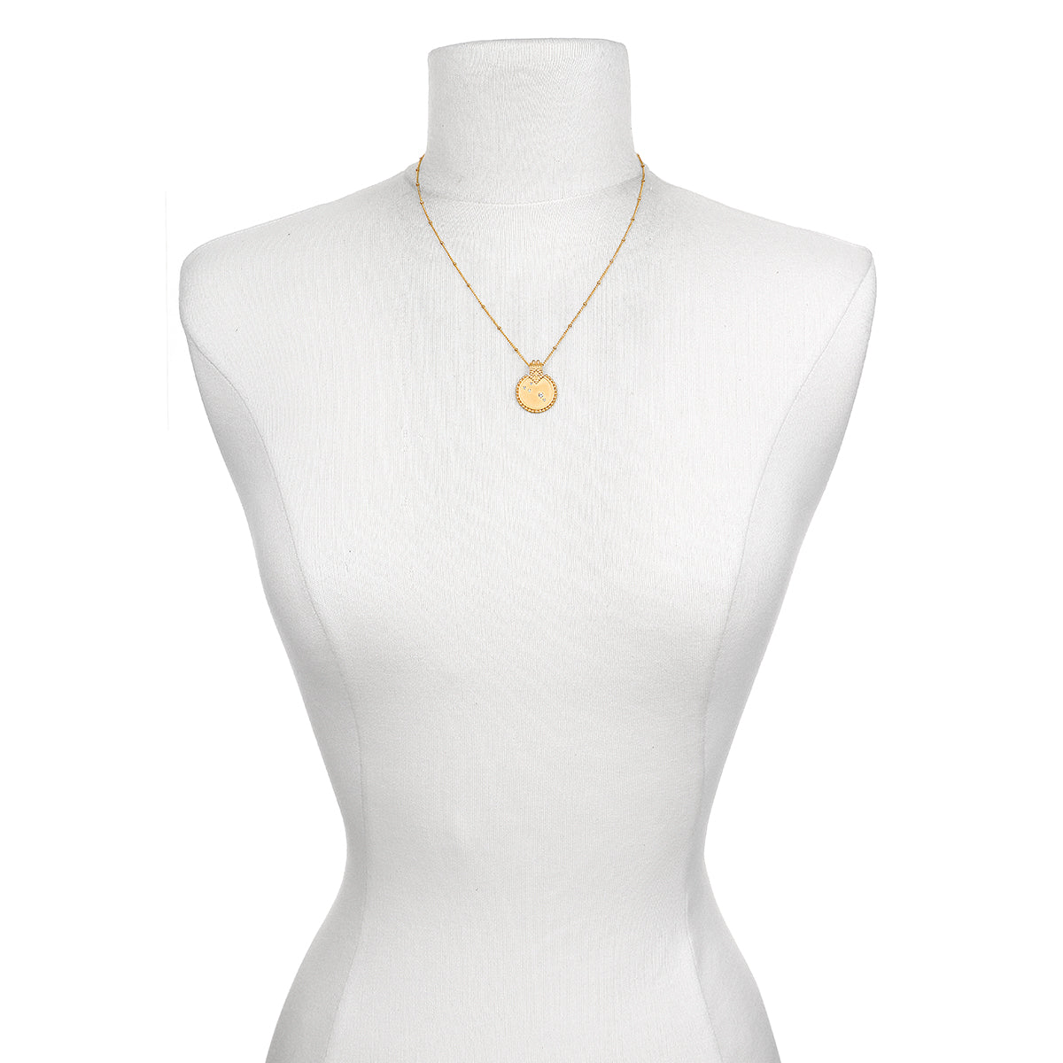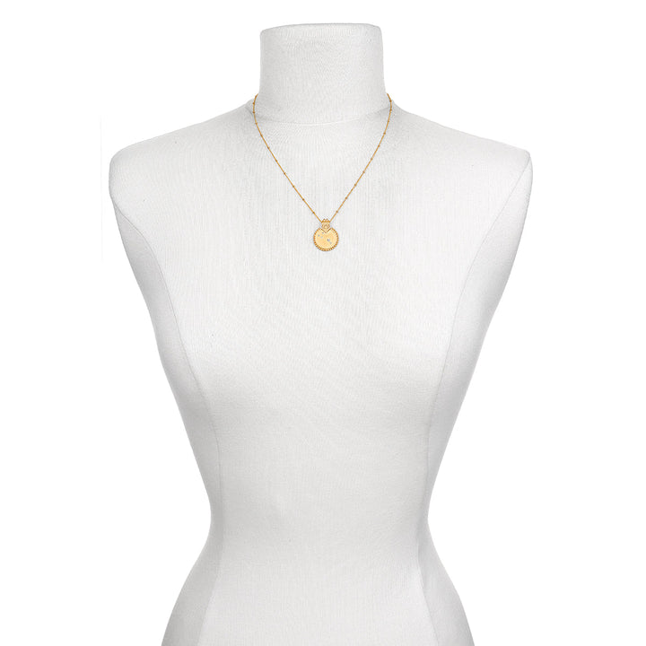 Crafted from 18kt gold plate over brass, the pendant measures 20mm. The necklace length is 18 inches.