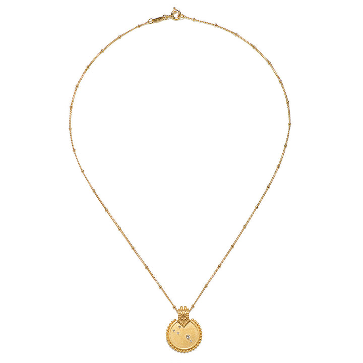 This striking 18kt gold plated necklace features a white topaz pendant, embodying the essence of Aries with its vibrant energy and creativity. The design reflects the passionate and adventurous spirit of those born between March 21st and April 18th, making it an ideal accessory for self-expression.