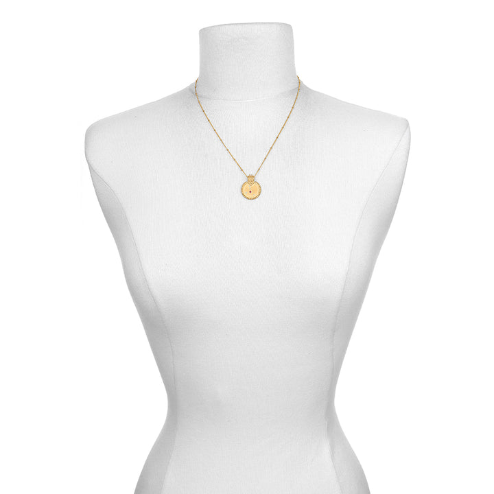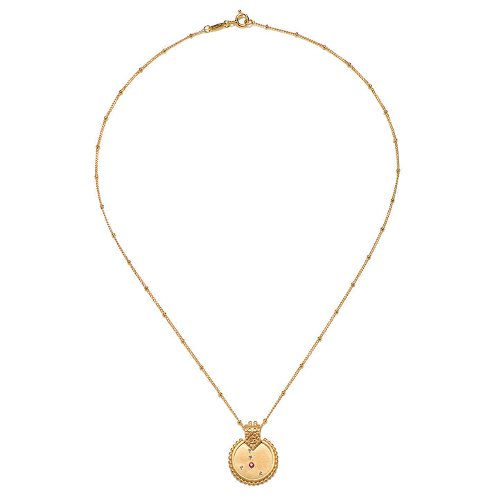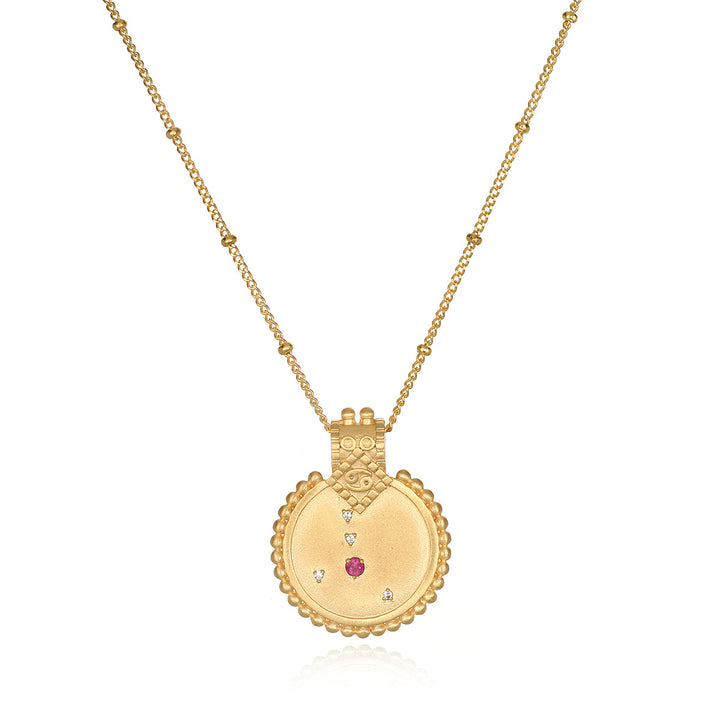Style Notes: Embrace the nurturing nature of Cancer with this beautiful 18kt gold plated necklace featuring a ruby, symbolizing passion and warmth. The pendant is engraved with meaningful designs, making it a perfect accessory for those born between June 21st and July 22nd, celebrating their love for home and family.