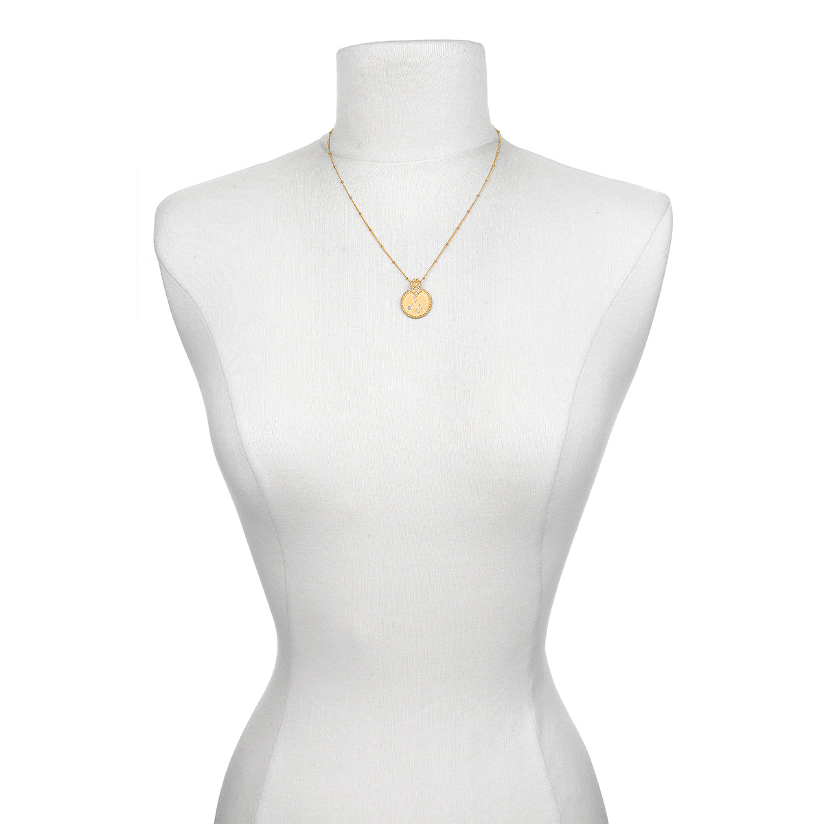 Made from 18kt gold plate over brass, the pendant measures 20mm. Necklace length is 18 inches.