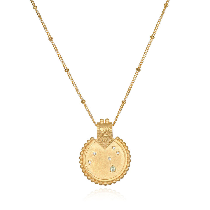 This stunning 18kt gold plated necklace features a peridot gemstone, symbolizing the radiant energy and leadership qualities of Leo. The intricate design reflects the creative and enthusiastic nature of Leos, making it an ideal accessory for those born between July 23rd and August 22nd, celebrating their vibrant spirit.