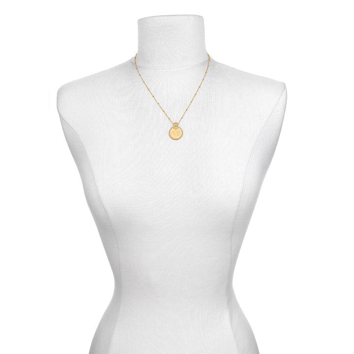 Crafted from 18kt gold plate over brass, the pendant measures 20mm. Necklace length is 18 inches.