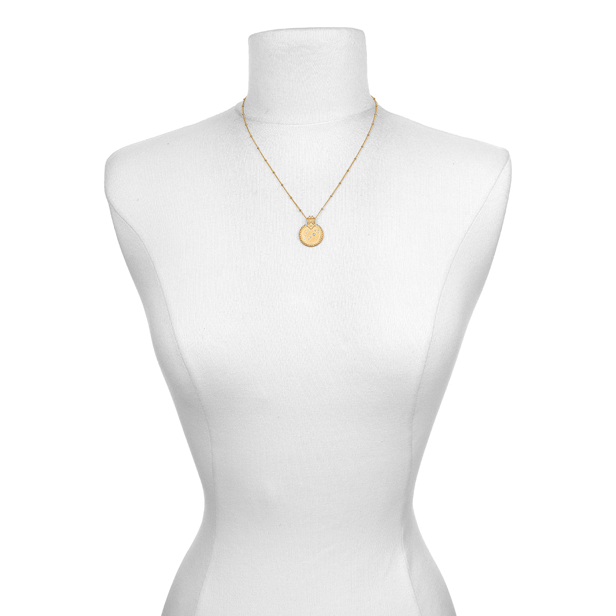 Crafted from 18kt gold plate over brass, the pendant measures 20mm. Necklace length is 18 inches.