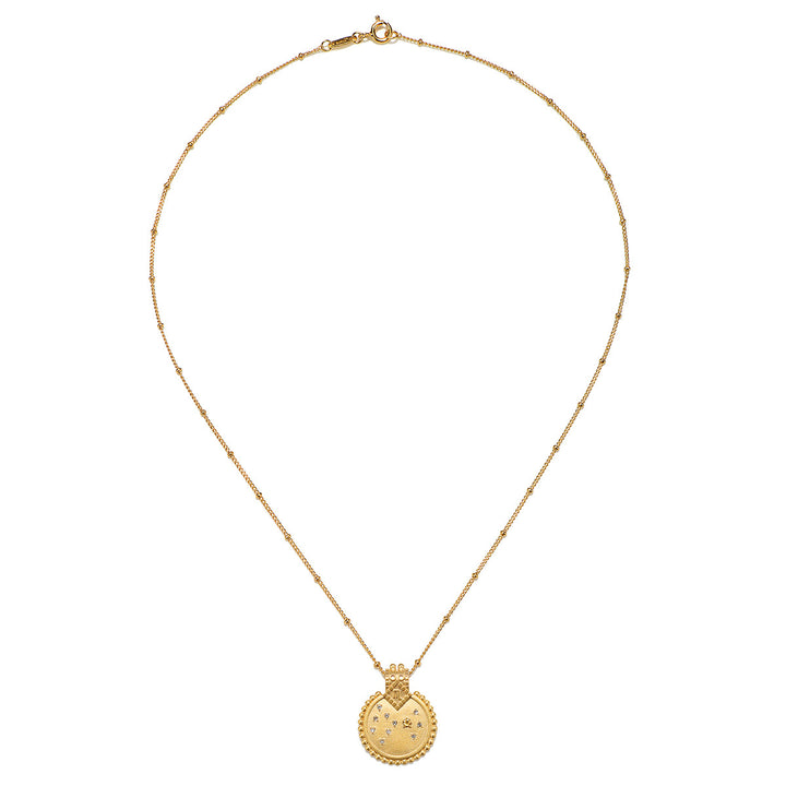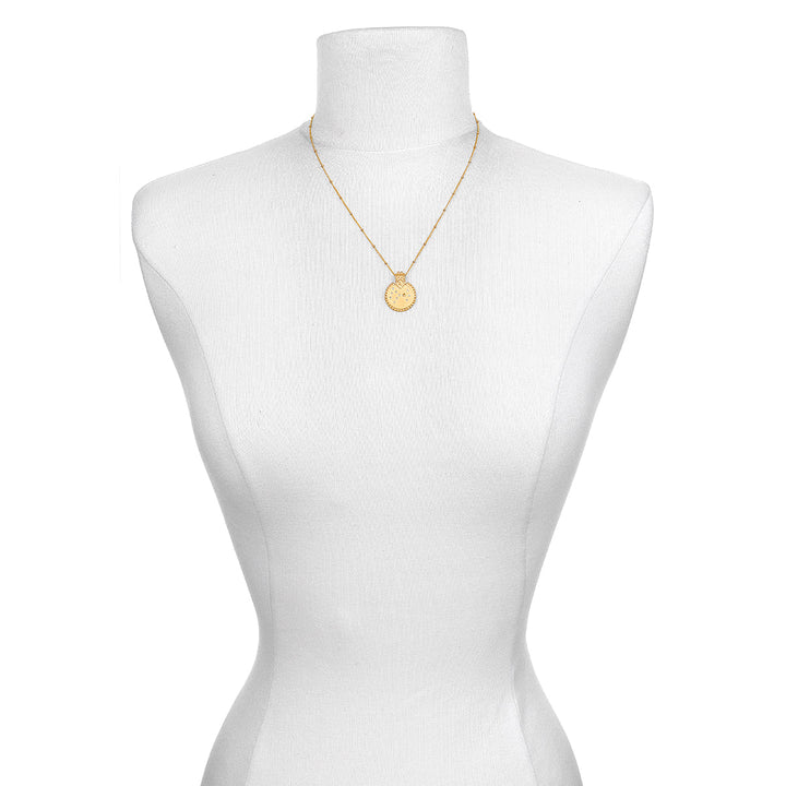 Crafted from 18kt gold plate over brass, the pendant measures 20mm. Necklace length is 18 inches.