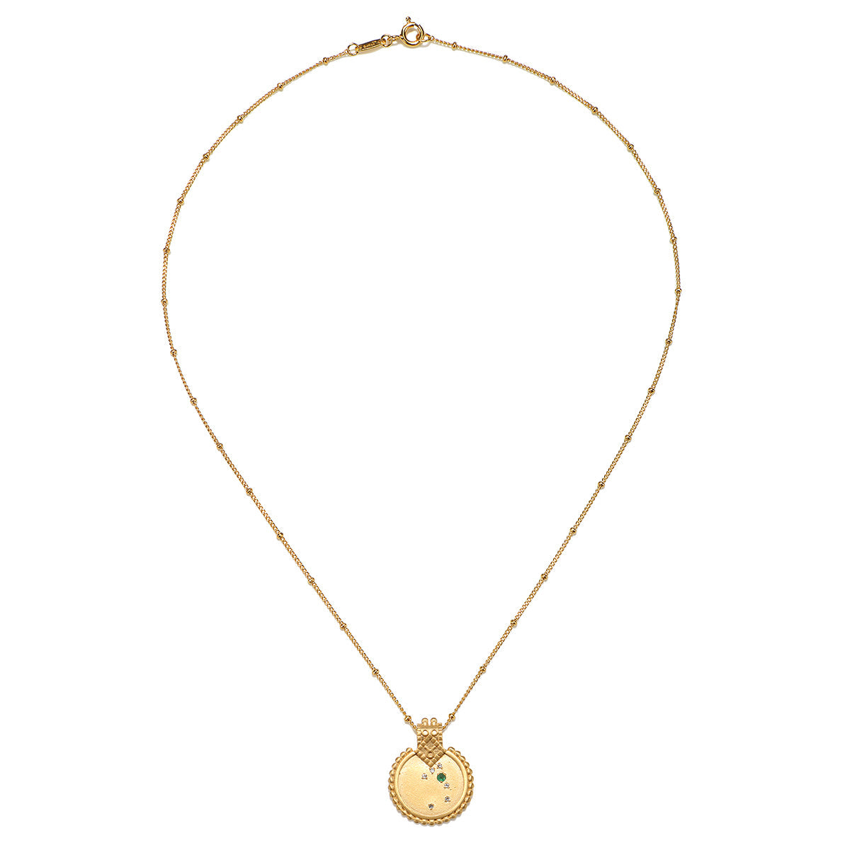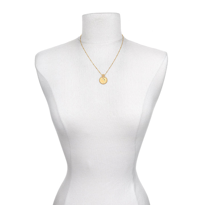 Made from 18kt gold plate over brass, the pendant measures 20mm. Necklace length is 18 inches.