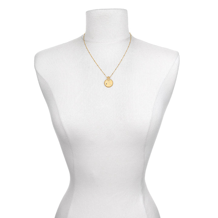 Crafted from 18kt gold plate over brass, the pendant measures 20mm. Necklace length is 18 inches.
