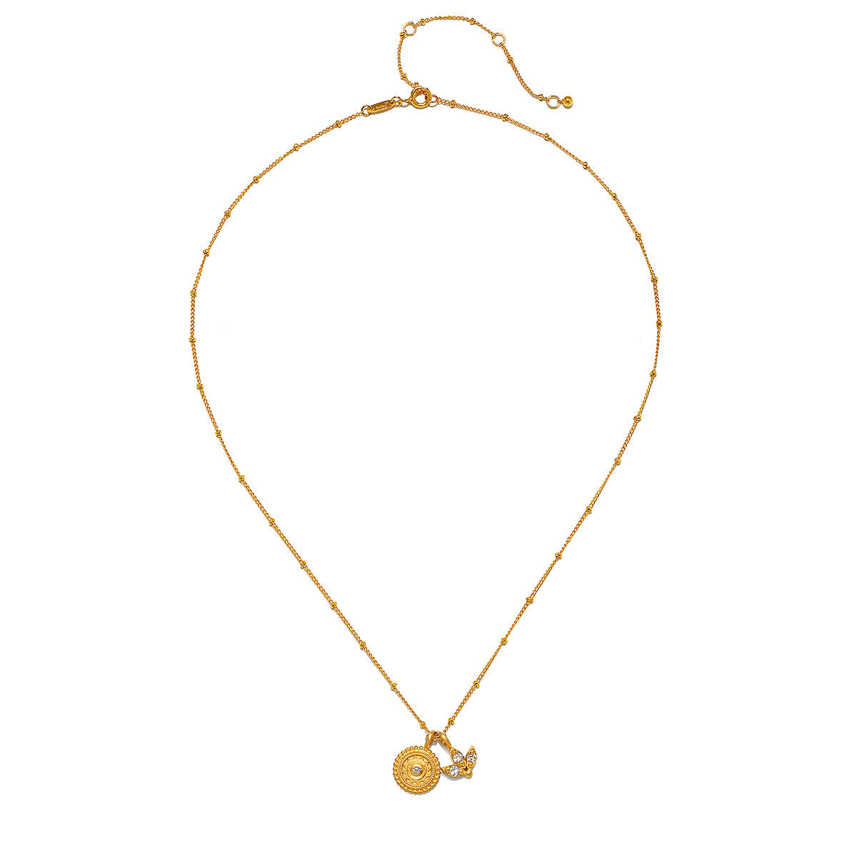 This delicate 18kt gold plated necklace features a lotus flower charm and a beaded medallion, symbolizing new beginnings and full potential. The white topaz accents ignite individuality and creativity, making it a meaningful accessory for those starting a new chapter in their lives.