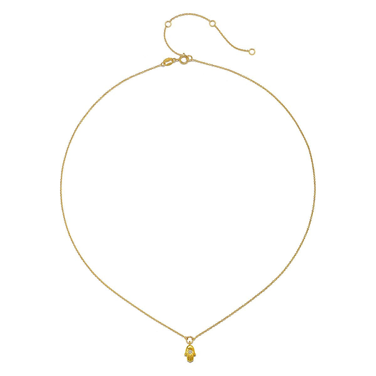 Crafted from 14kt gold, the hamsa pendant measures 8 x 5.5 mm. The necklace length is 16 inches with a 3-inch extension. Features a 2mm round diamond.