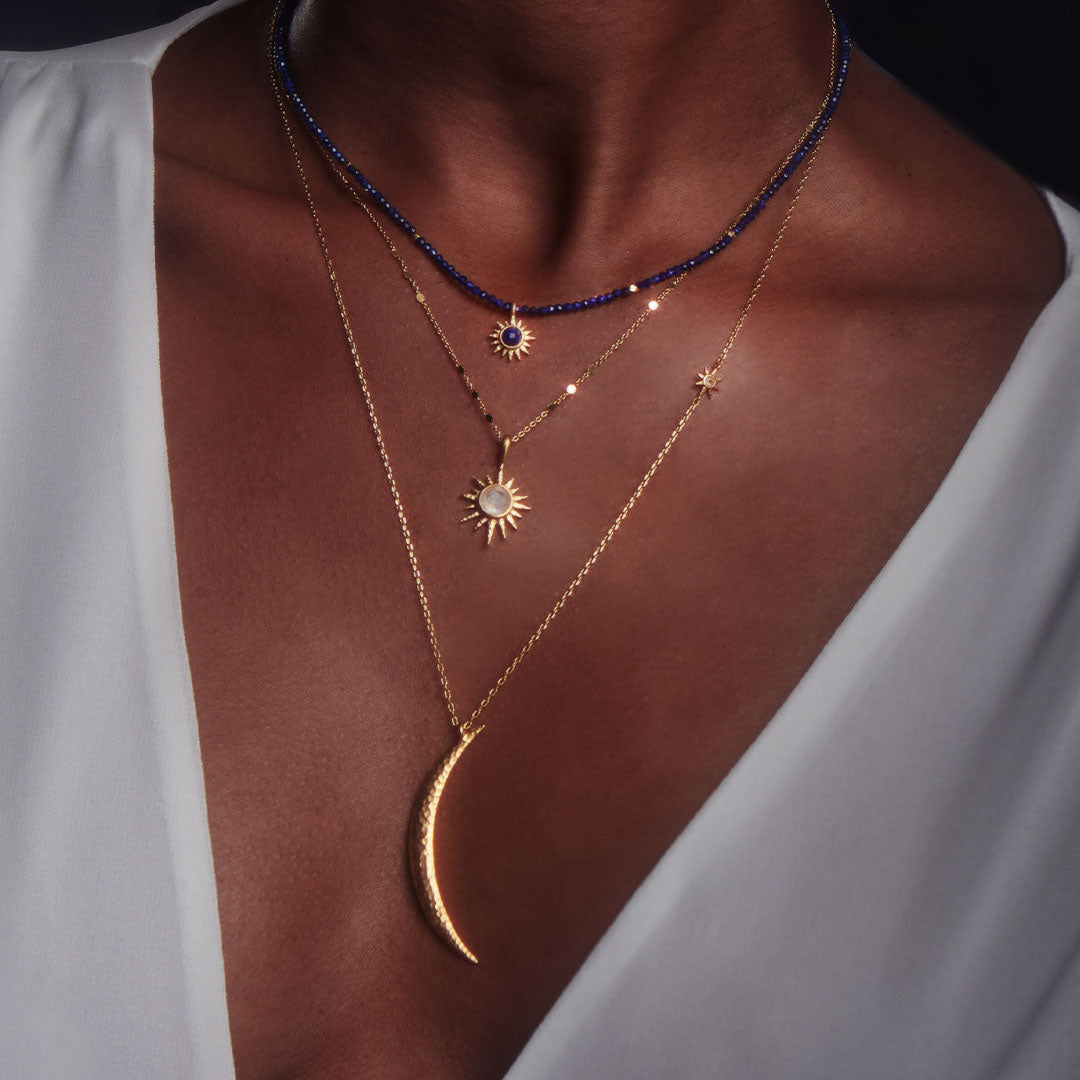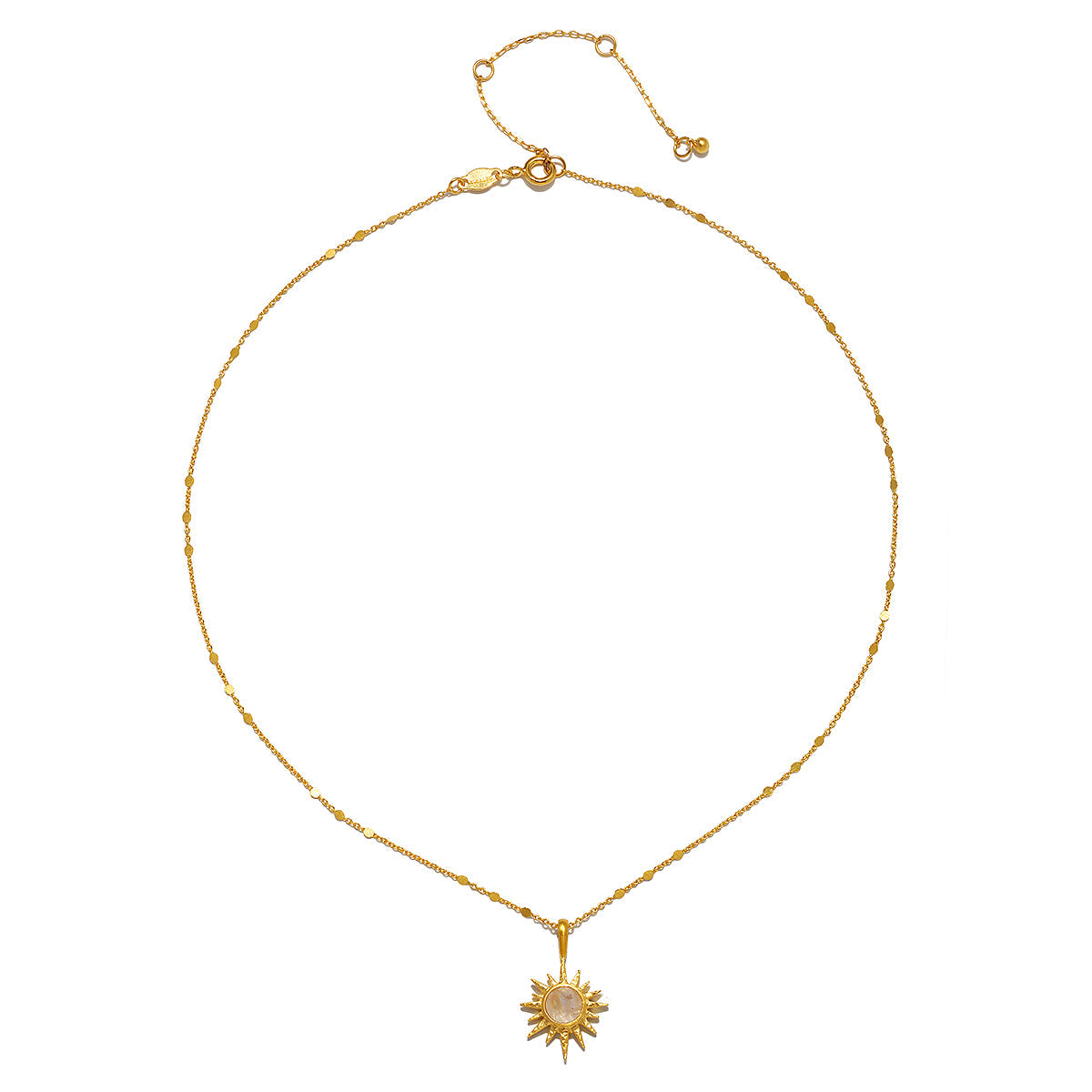 This luminous north star moonstone starburst necklace serves as a beacon of guidance for your journey. The striking moonstone, known for intuition and passion, is set among a beaming 18kt gold plate starburst, creating a meaningful and beautiful accessory.
