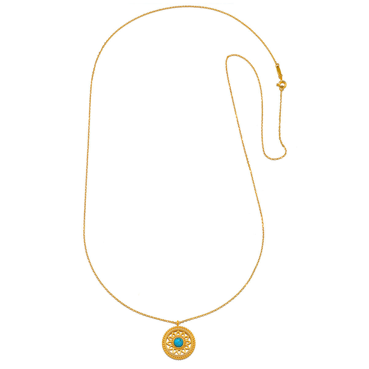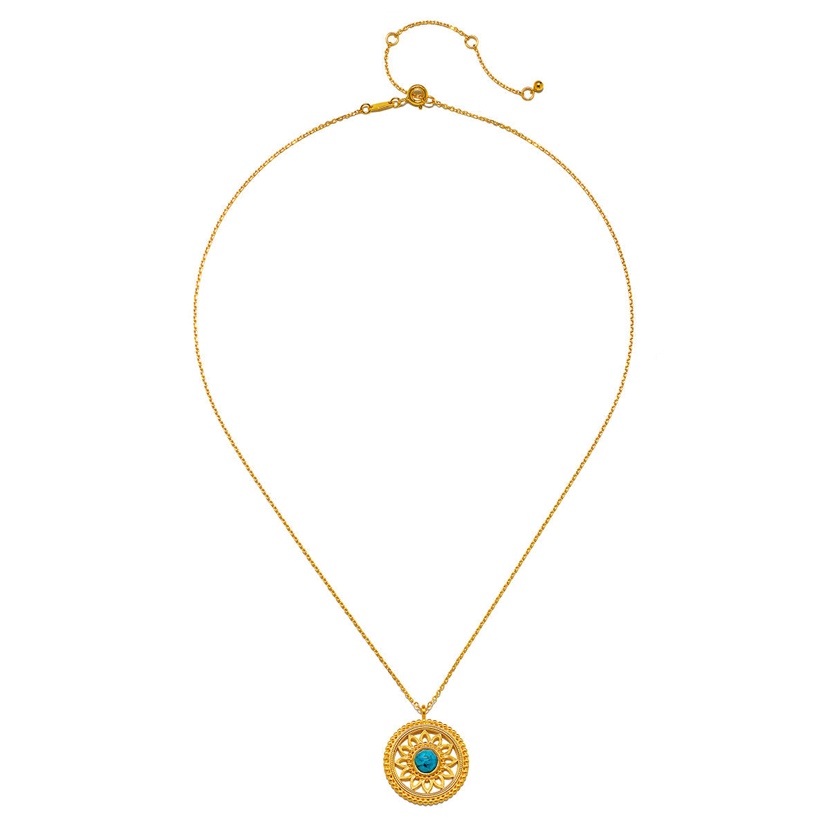 Made from 18kt gold plate over brass, the pendant size is 23mm, featuring a 6mm faceted round turquoise stone. Necklace length is 18 inches with a 3-inch extender chain.