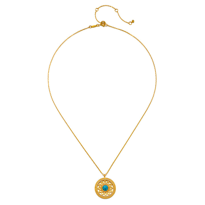 Embrace your intuition with this vibrant turquoise mandala necklace. The striking turquoise, known for health and self-expression, is featured prominently in the open-work mandala pendant, symbolizing the sacred infinite cycle. A perfect accessory for nurturing your inner wisdom.