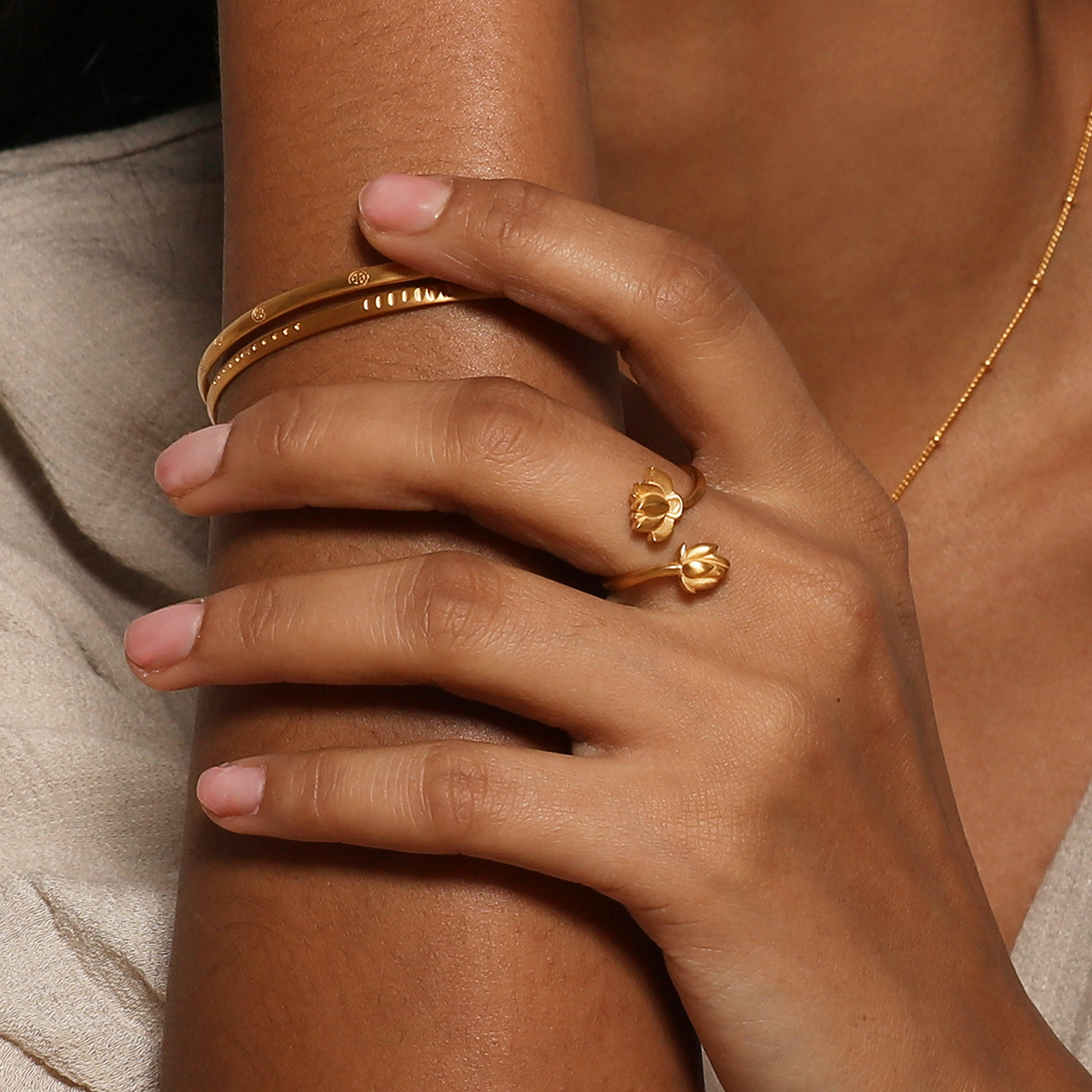 This open-to-possibilities double lotus ring features two intricate lotus flowers, symbolizing new beginnings and potential. The adjustable 18kt gold plated ring can be worn alone or stacked with other rings for a personalized look, allowing for endless styling possibilities.