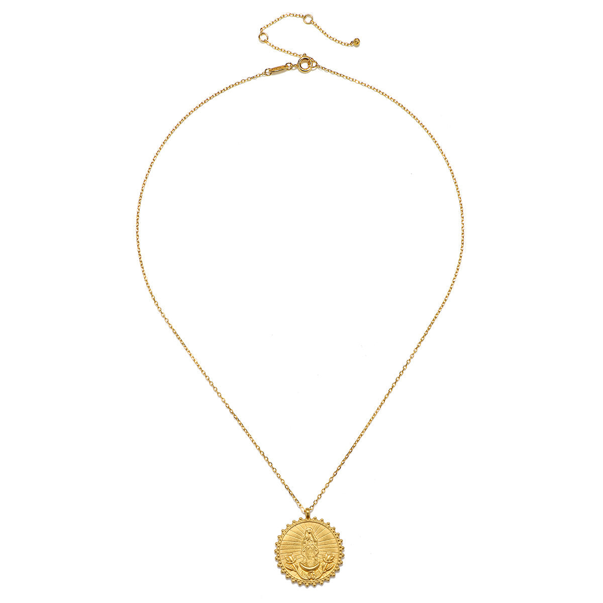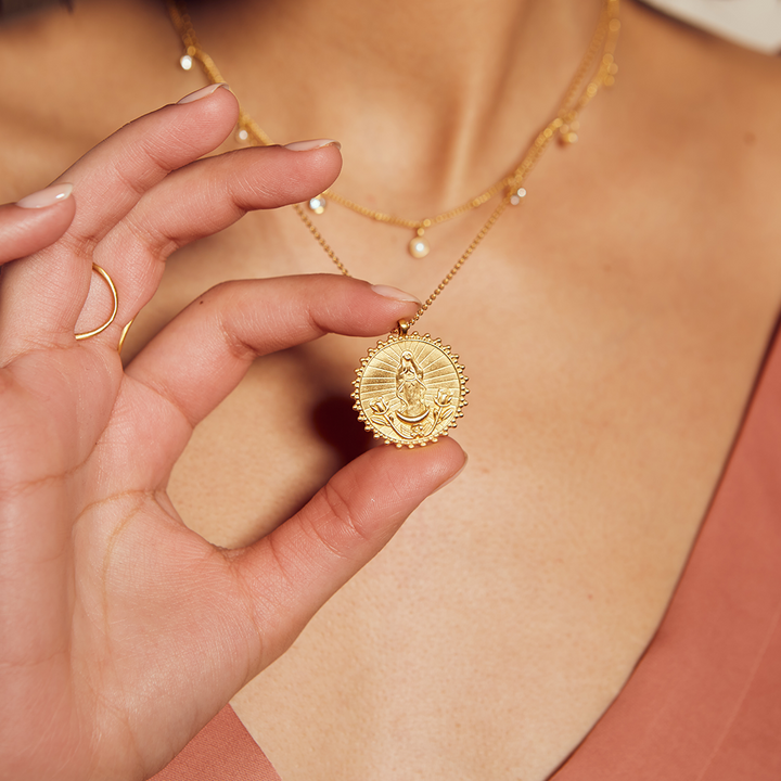 This divine motherhood necklace features an 18kt gold plate coin pendant adorned with Virgen De Guadalupe, an iconic symbol representing motherhood, hope, and unconditional love. This piece captures the essence of maternal love and serves as a beautiful reminder of its divine nature.