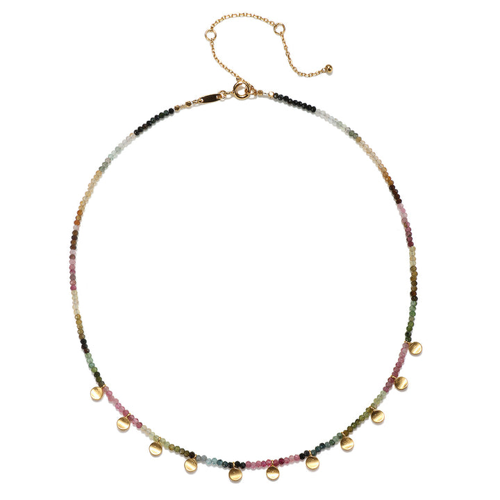The peace and protection necklace is adorned with tourmaline, known for its charitable and peaceful attributes. The 18k gold charms in the shape of the moon symbolize nourishment and protection, creating a harmonious piece ideal for everyday wear.