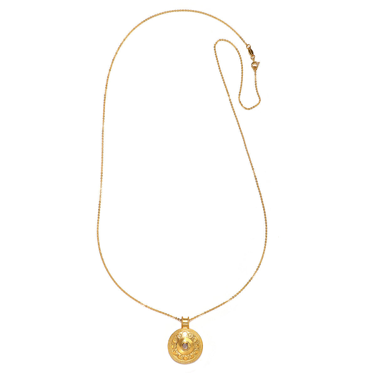 The cycles of the moon necklace celebrates divine feminine energy, featuring a luminous moonstone surrounded by hand-engraved phases of the moon. This statement piece ignites your inner goddess, making it a perfect accessory for any occasion.