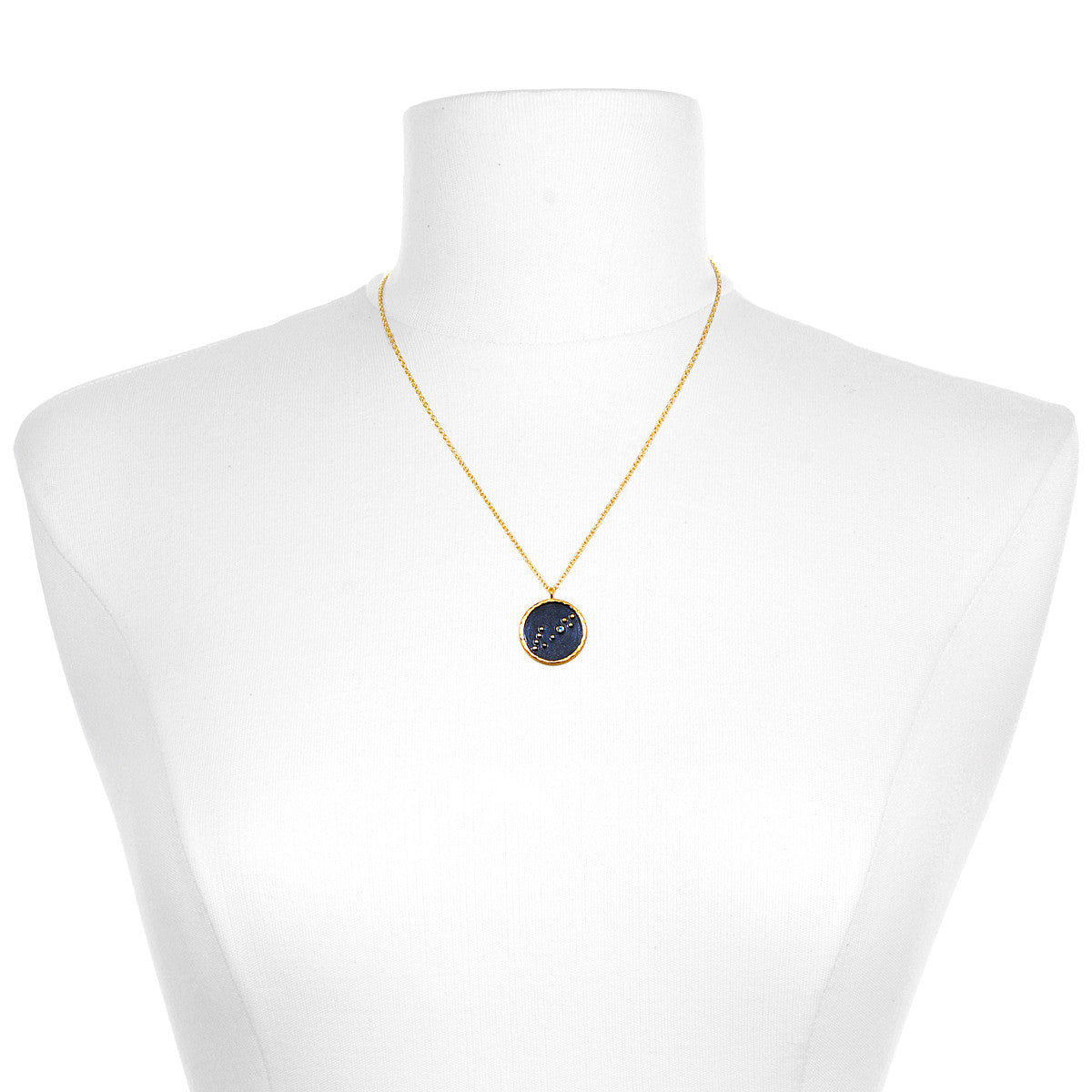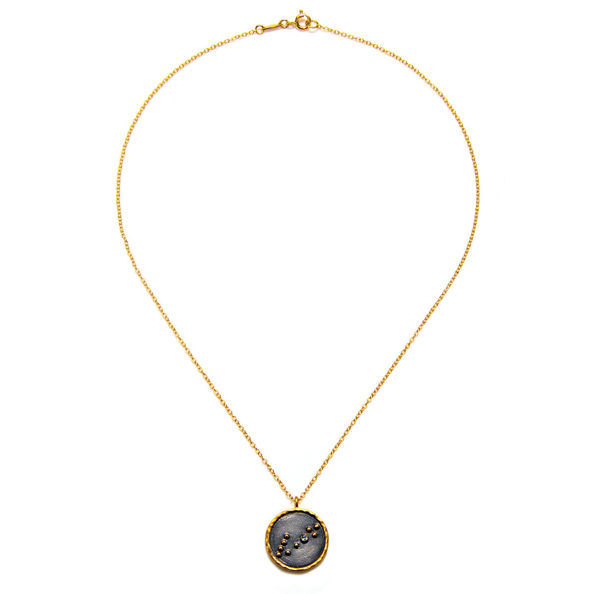 Pendant diameter of 0.8 inches, with a necklace length of 18 inches, crafted in 18kt gold plate and gunmetal over brass.