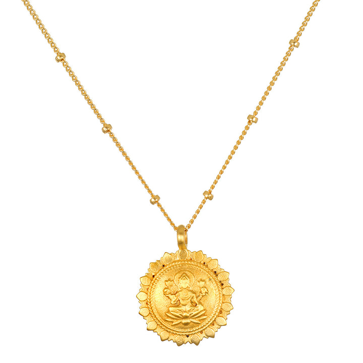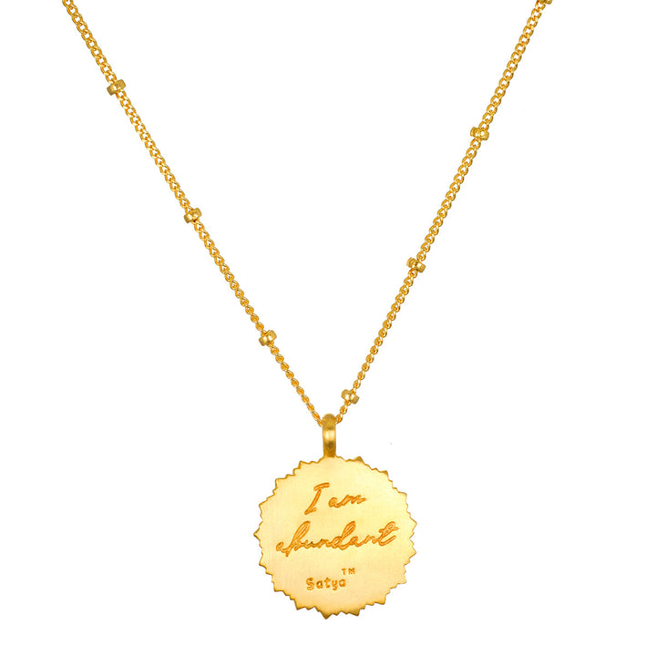 The Prosperous Blessings necklace features the goddess Lakshmi, surrounded by lotus petals that symbolize new beginnings. The mantra 'I Am Abundant' on the back serves as a daily reminder of your journey towards prosperity.