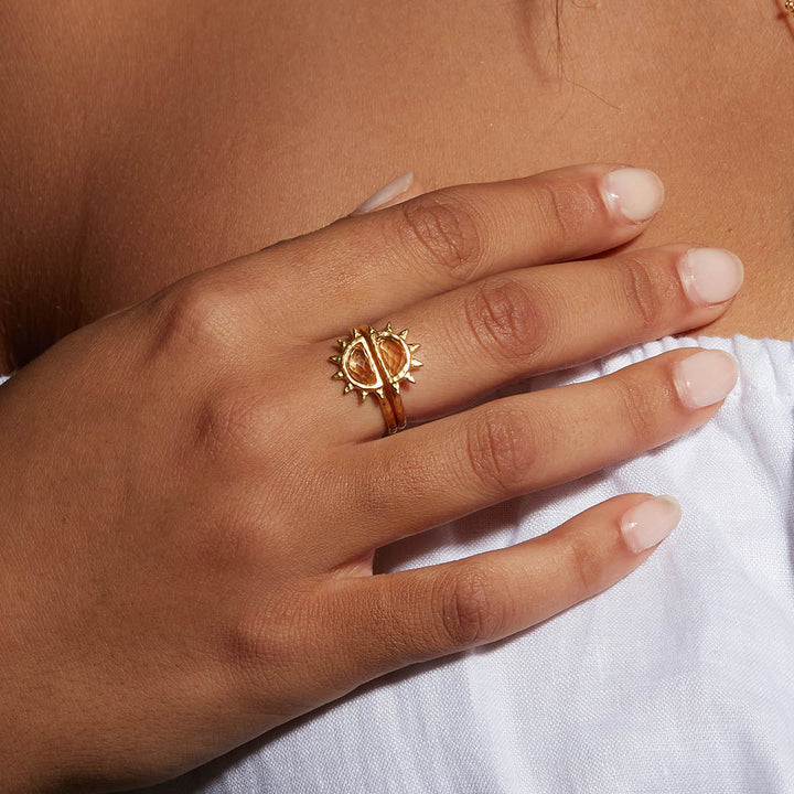 The Reclaim Joy Citrine Sunrise Ring features a brilliant citrine sunrise set in 18kt gold plating, symbolizing radiance and happiness. This eye-catching piece serves as an uplifting reminder to embrace joy in your life.