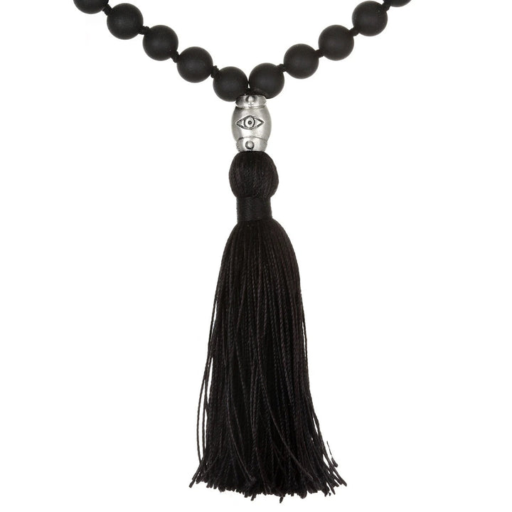 Made with matte onyx beads, featuring an evil eye symbol, 925 sterling silver, and a necklace length of 40''.