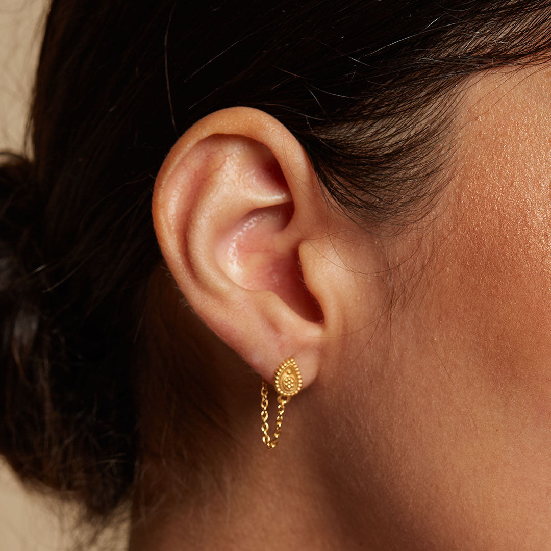 The Sacred Continuation Chain Earrings feature paisley symbols, representing life and fertility, with delicate gold chains that flutter gracefully.