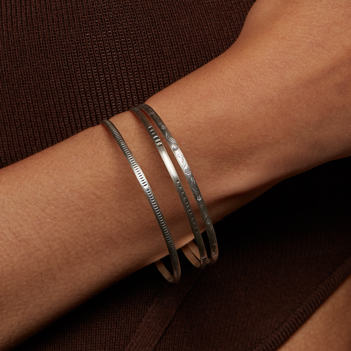The Silver Etched Bangle Melody features a hand-stamped traditional design, making it a versatile addition to your bracelet collection.