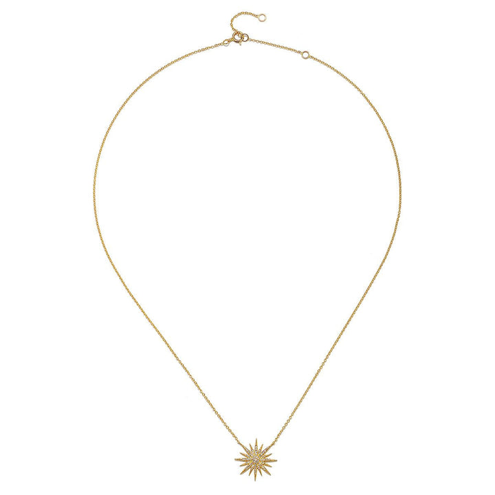 The Starburst Diamond 14kt Gold Necklace features a stunning starburst pendant symbolizing inspiration and guidance, adorned with diamonds that create a timeless heirloom piece.