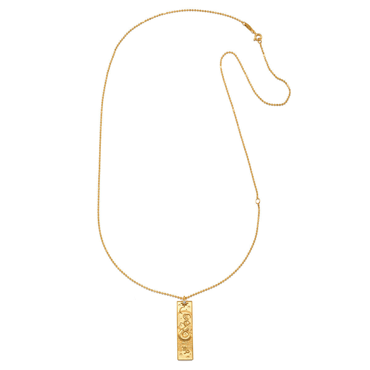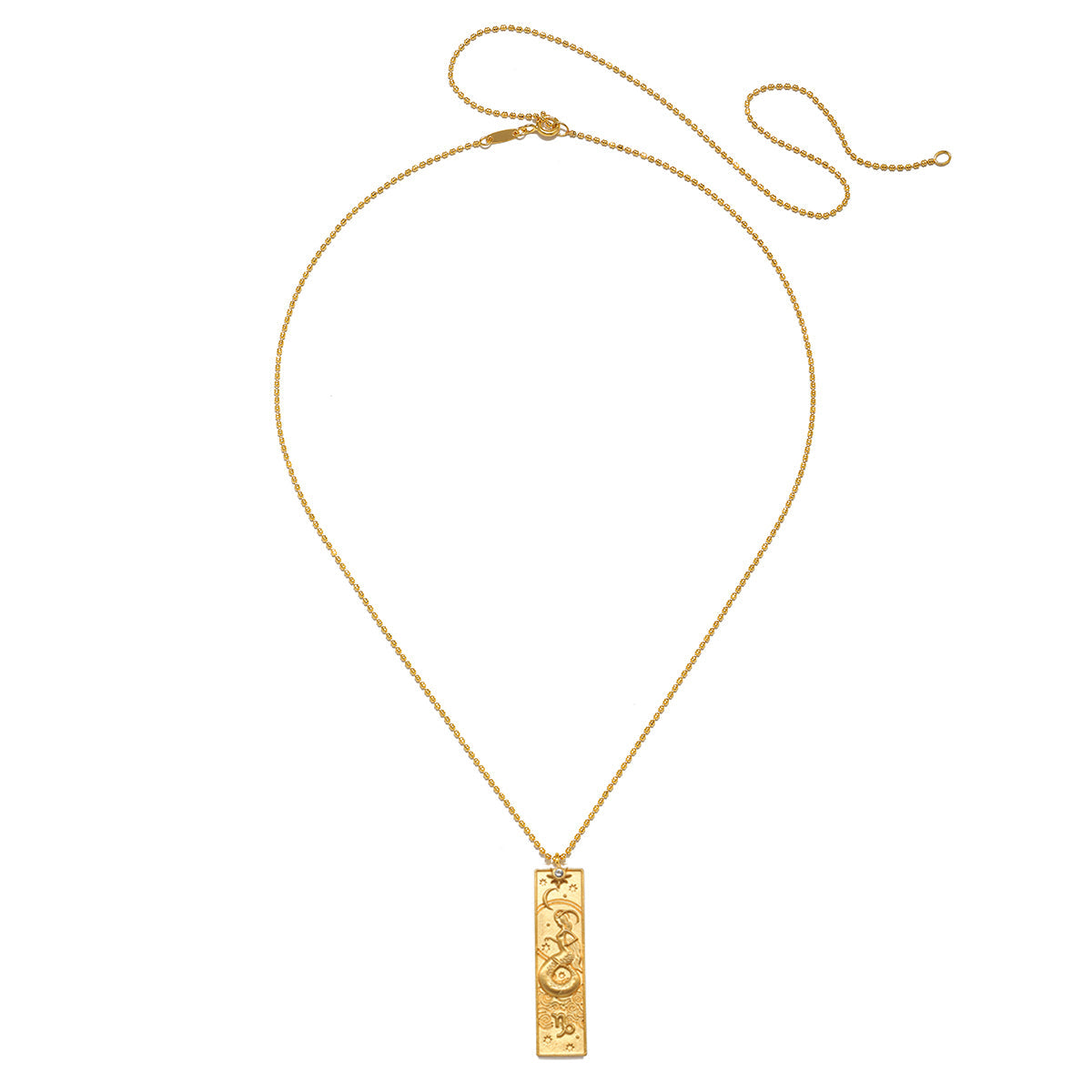 Crafted from 18kt gold plate over brass, the pendant measures 42 x 11mm. The necklace length is 18', adjustable to 28', and includes a 1.2mm camilla chain. Manufactured in Thailand, the necklace comes with a one-year warranty.