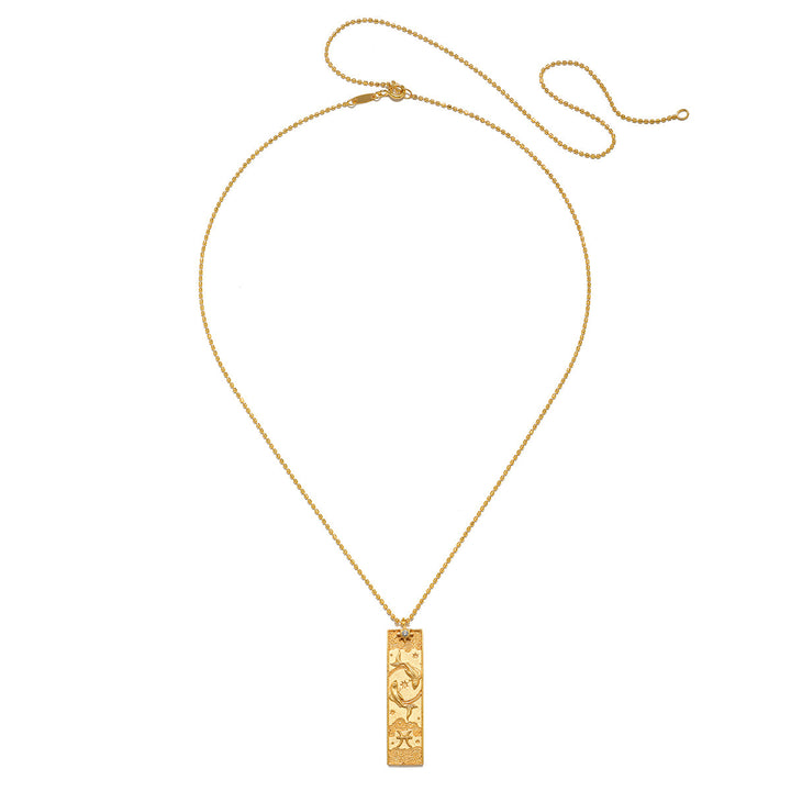 Made from 18kt gold plate over brass, the pendant measures 42 x 11mm. The necklace length is 18', adjustable to 28', and includes a 1.2mm camilla chain. Manufactured in Thailand, this necklace comes with a one-year warranty.