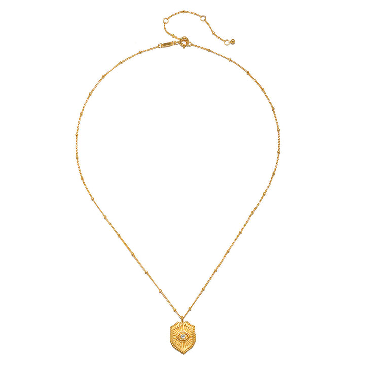 The Protect Your Peace Necklace mirrors the charm with a shield pendant and evil eye, creating a protective accessory for daily wear.
