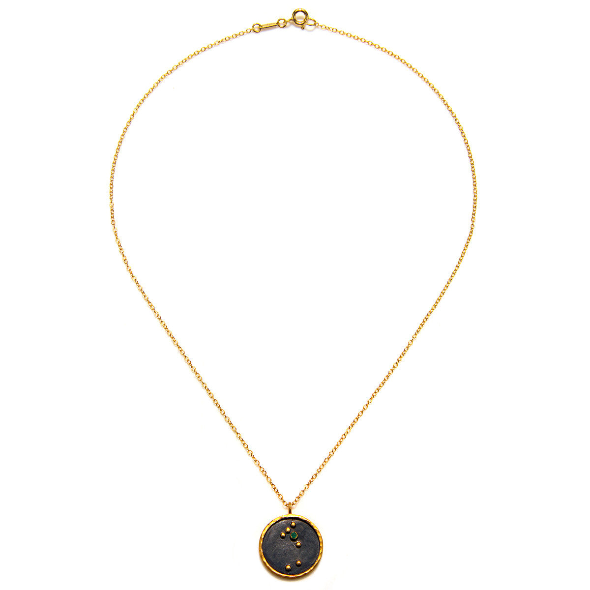 Made from 18kt gold plate and gunmetal over brass, with a pendant diameter of 0.8” and a necklace length of 18”.
