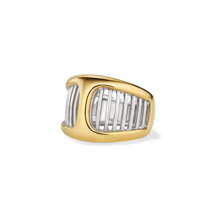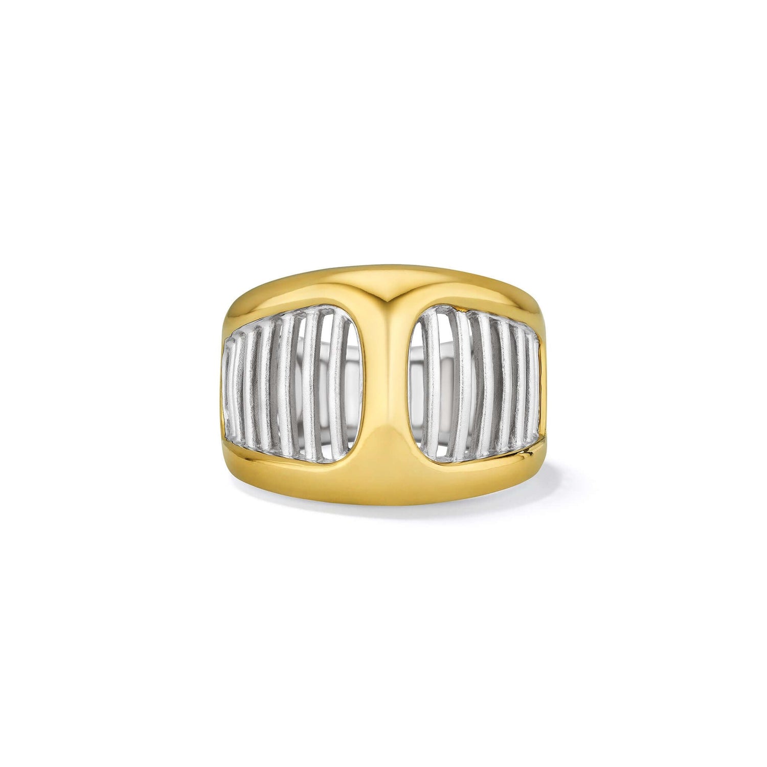 Sterling silver and 18k gold. Dimensions: Width: ¾'.
