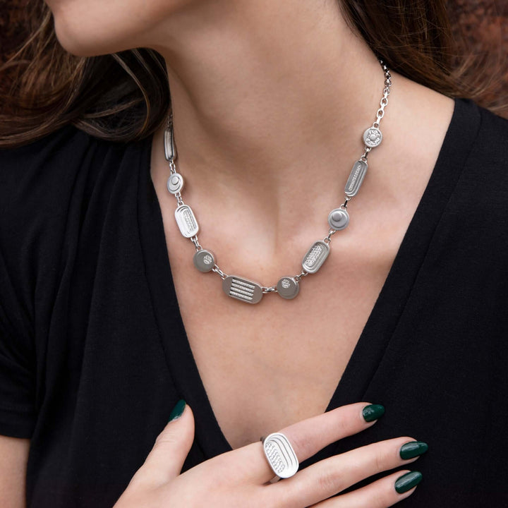 Judith Ripka founded her iconic namesake brand in New York City in 1977. Starting from her living room as a single mother in her 20s, little did she know she would build a jewelry empire. Passionate about jewelry that fit effortlessly into a woman's life and embodied their wishes, dreams and meaningful moments, Ripka's designs captivated hearts worldwide. Her signature creations are renowned for their intricate detailing, vibrant gemstones and exquisite craftsmanship. Today her legacy continues to inspire.Style notes: Inspired by the Art Deco movement, the limited-edition Ayah Collection by renowned New York-based architect Amale Andraos, embodies unique artistic craftsmanship with a cool satin finish. Price: Please note price may vary due to exchange rate differences or shipping, duties and taxes. Price may also vary with materials choice. Final price is calculated at checkout at the designer's website. Materials: Sterling silver with white sapphire. Dimensions: Length: 17'. Width: ½'.