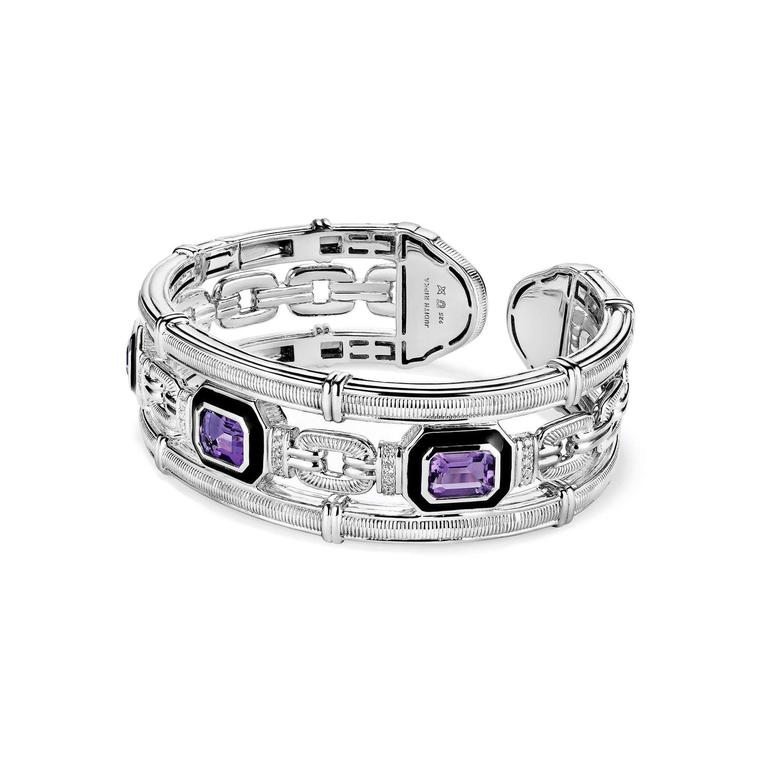 Judith Ripka founded her iconic namesake brand in New York City in 1977. Starting from her living room as a single mother in her 20s, little did she know she would build a jewelry empire. Passionate about jewelry that fit effortlessly into a woman's life and embodied their wishes, dreams and meaningful moments, Ripka's designs captivated hearts worldwide. Her signature creations are renowned for their intricate detailing, vibrant gemstones and exquisite craftsmanship. Today her legacy continues to inspire.Style notes: The Adrienne collection reinvents the past with a daring sensibility. Inspired by Adrienne's architecture, this collection celebrates 1930s Parisienne Art deco in textured sterling silver, diamonds and colored gemstones.Price: Please note price may vary due to exchange rate differences or shipping, duties and taxes. Price may also vary with materials choice. Final price is calculated at checkout at the designer's website. Materials: Sterling silver with 0.24ctw pavé diamonds, enamel and Amethyst. Dimensions: Width: ¾', Diameter: 2 ½'.