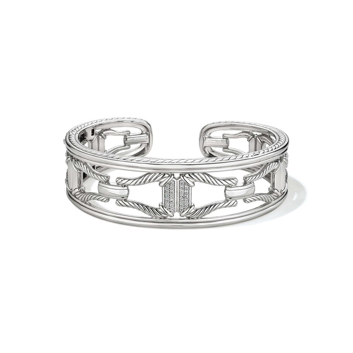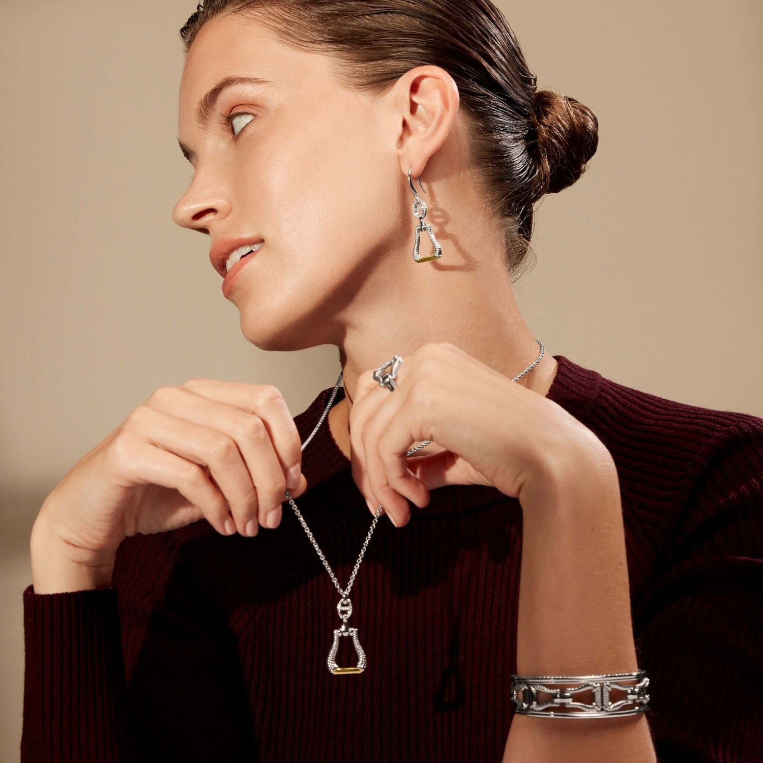 Judith Ripka founded her iconic namesake brand in New York City in 1977. Starting from her living room as a single mother in her 20s, little did she know she would build a jewelry empire. Passionate about jewelry that fit effortlessly into a woman's life and embodied their wishes, dreams and meaningful moments, Ripka's designs captivated hearts worldwide. Her signature creations are renowned for their intricate detailing, vibrant gemstones and exquisite craftsmanship. Today her legacy continues to inspire.Style notes: Simple and sophisticated. Make a bold statement with the Vienna Stirrup Cuff, inspired by the details of equestrian hardware along with the precision and refinement of this long-revered art form.Price: Please note price may vary due to exchange rate differences or shipping, duties and taxes. Price may also vary with materials choice. Final price is calculated at checkout at the designer's website. Materials: Sterling silver with 0.19ctw pavé diamonds. Dimensions: Diameter: 2 ¼'. Width: ¾'.