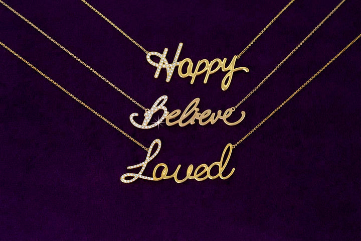 This Happy Nameplate Necklace by Simone I. Smith is a joyful accessory that adds a positive and uplifting message to your everyday look. The sleek and simple design makes it perfect for layering or wearing as a solo piece to spread good vibes.