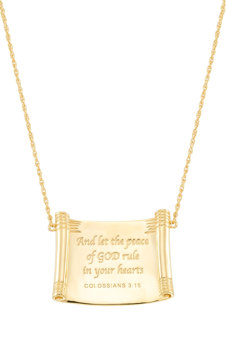 This Colossians 3:15 Necklace by Simone I. Smith carries the profound message, 'And let the peace of God rule in your hearts,' inscribed in gold. The necklace is a constant source of encouragement, offering both spiritual and aesthetic beauty.