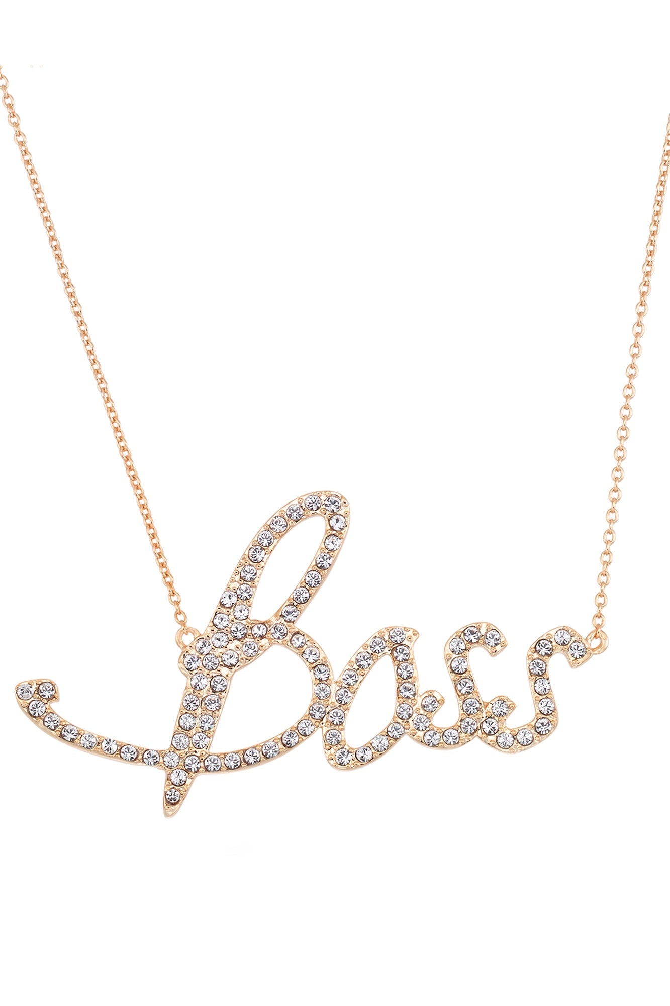 This Boss Nameplate Necklace - Extra Large by Simone I. Smith is a bold and empowering piece that makes a statement. The oversized design, adorned with sparkling crystals, represents strength and leadership, making it a standout accessory for those who embody the 'boss' mindset.