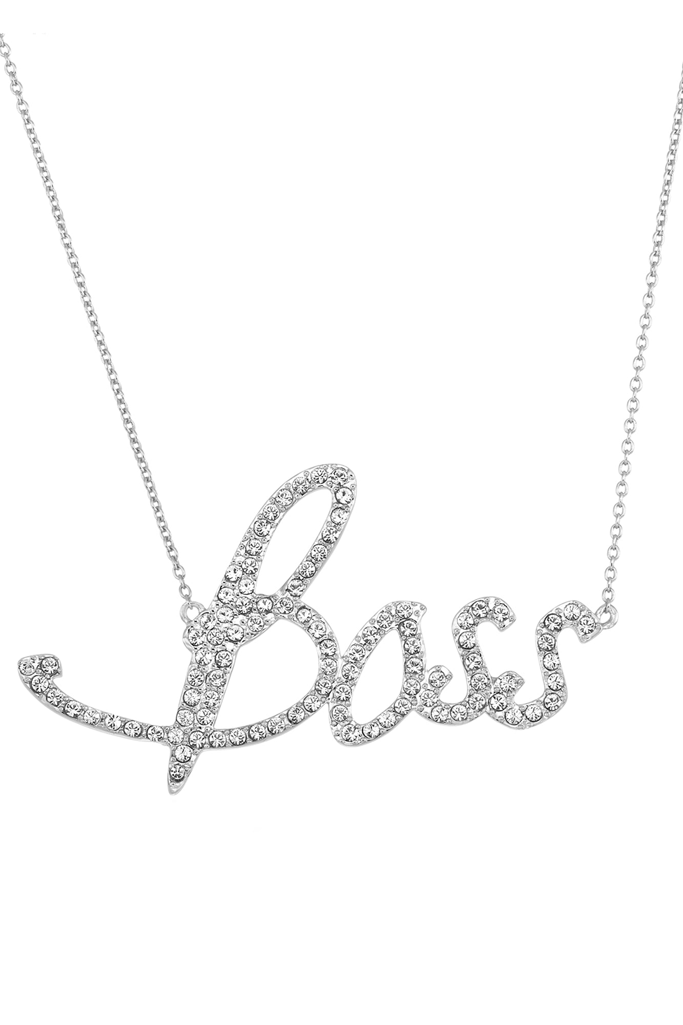 This Boss Nameplate Necklace - Extra Large by Simone I. Smith exudes confidence and power. Its sleek platinum finish and crystal accents create a luxurious and modern look, perfect for commanding attention in any setting.
