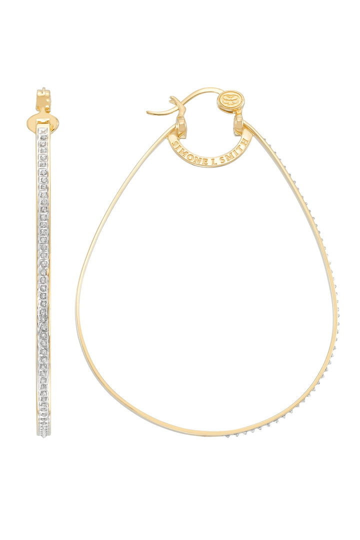 These Apple Bottom Hoops with Diamond Embellishments - Extra Large by Simone I. Smith feature a playful pear-shaped design. The diamond accents bring a touch of sophistication to the unique shape, making these hoops perfect for those who love to stand out.