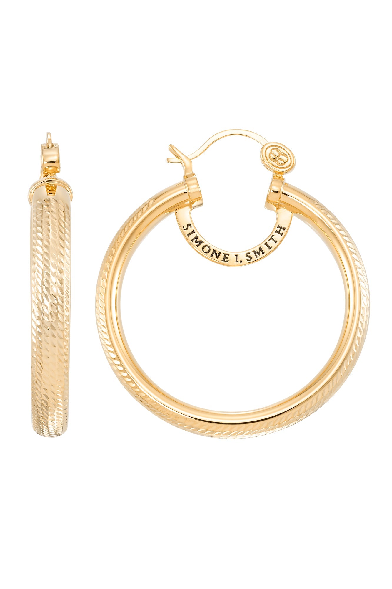 These Brilliance Hoops by Simone I. Smith feature a stunning diamond cut design, perfect for any occasion.