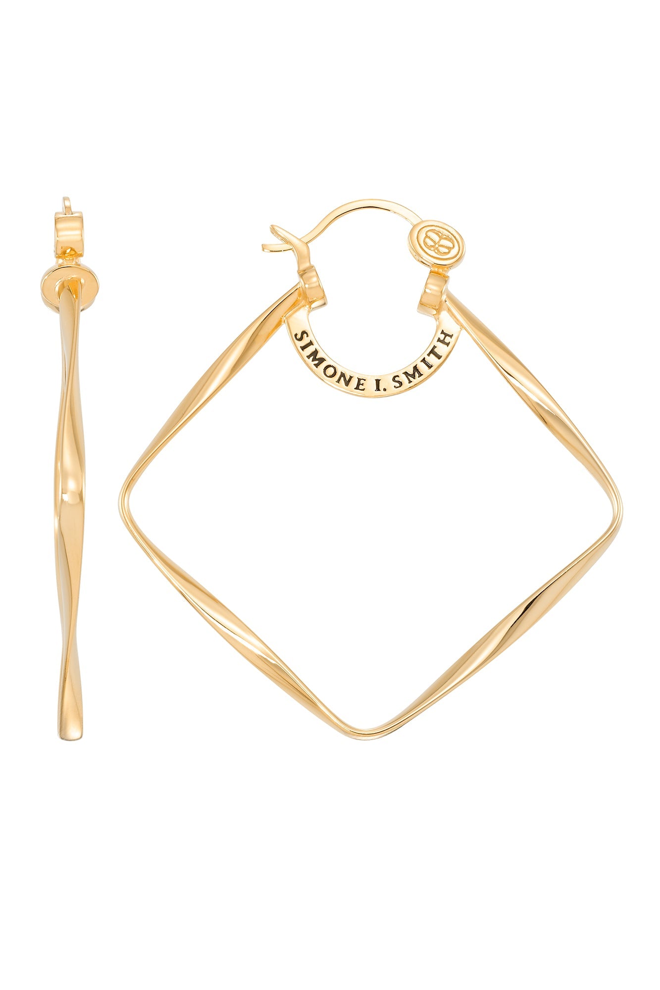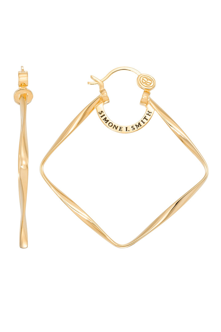 These Square Biz Hoops by Simone I. Smith: These diamond-shaped polished medium hoops showcase a striking design in 18kt yellow gold over sterling silver. Their unique shape captures light beautifully, adding a sophisticated touch to any outfit. These hoops symbolize confidence and style, making them a versatile choice for both casual and formal occasions. Ideal for stacking with other pieces for a layered look.