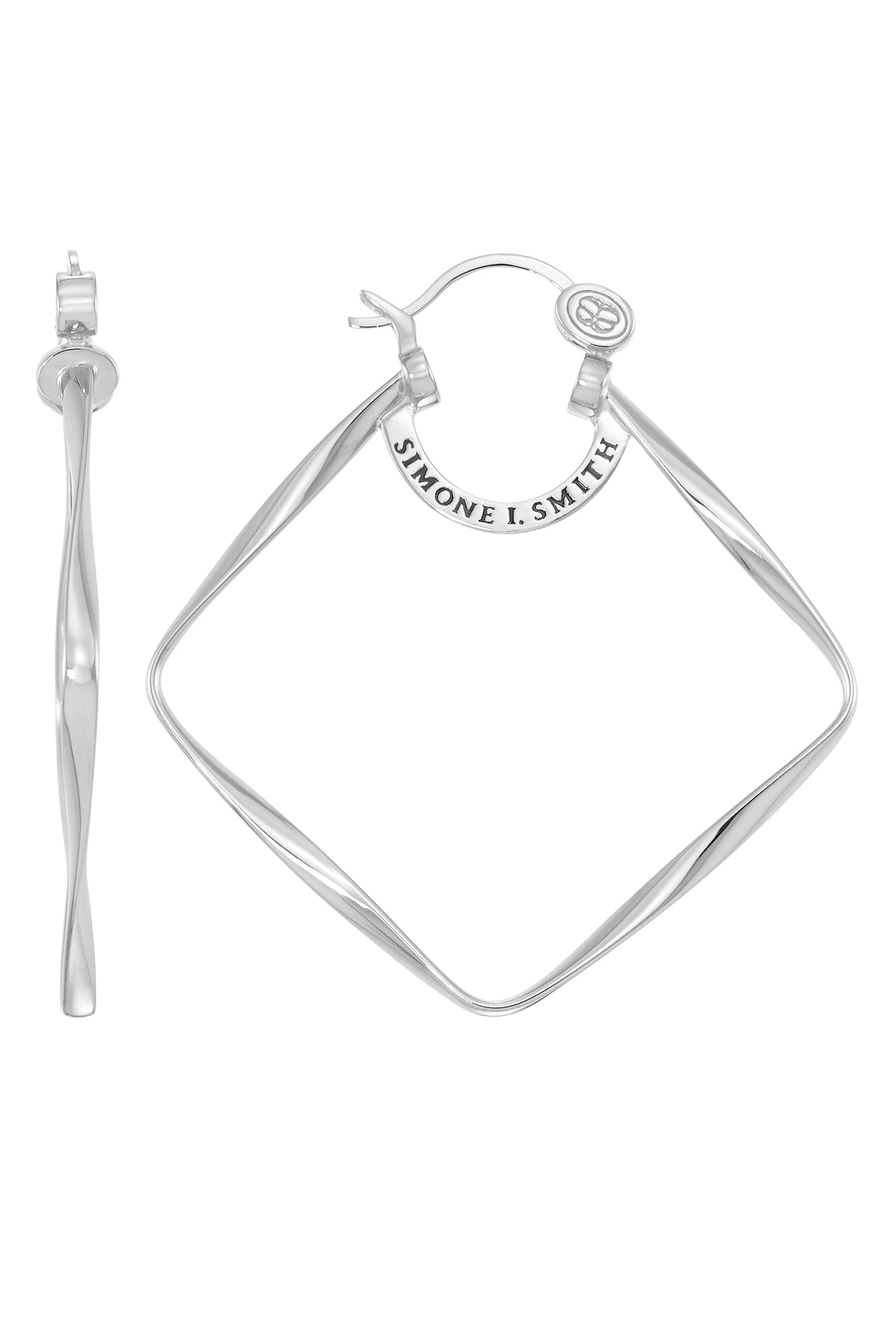 These Square Biz Hoops by Simone I. Smith: Crafted in platinum over sterling silver, these diamond-shaped polished medium hoops offer a sleek and elegant look. The clean lines and reflective surface create a modern aesthetic that perfectly complements any wardrobe. Representing strength and individuality, these hoops can be worn solo or styled in pairs for a bolder statement.