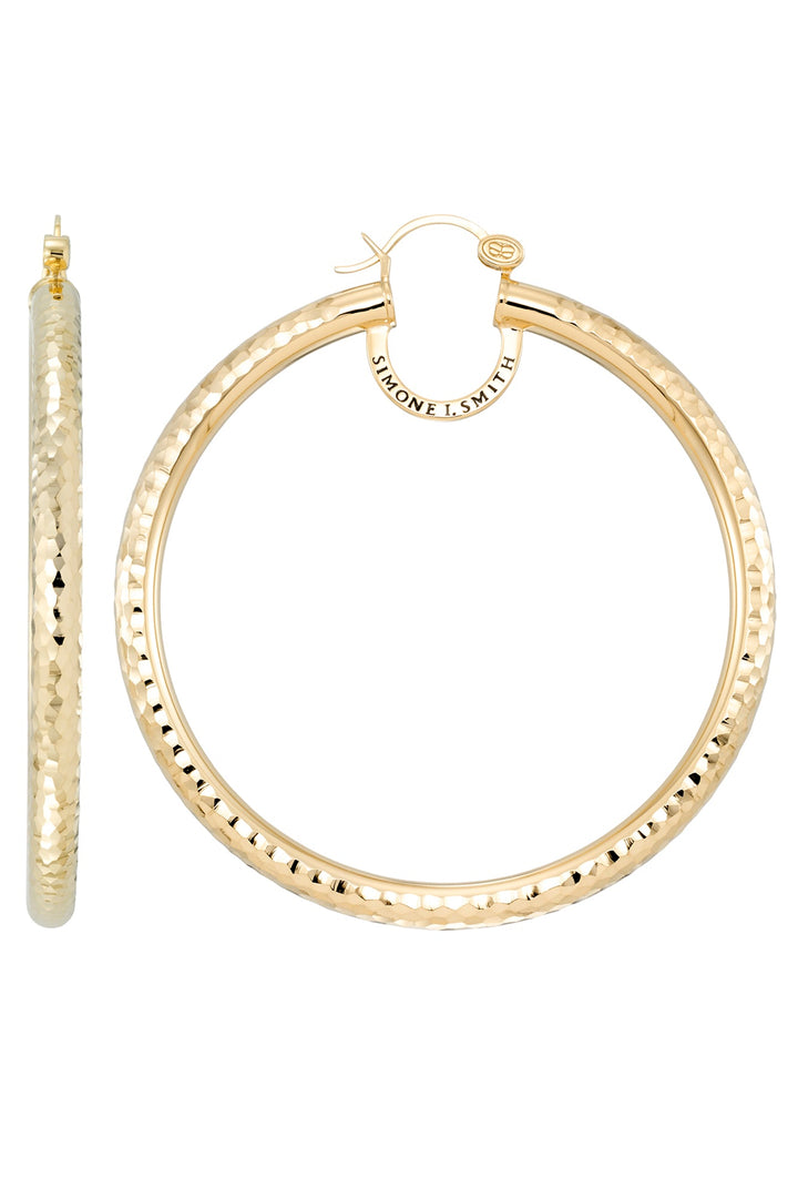 These Rocky Road Hoops - Extra Large by Simone I. Smith: These extra-large hoop earrings in 18kt yellow gold over sterling silver feature a rugged design that adds a bold touch to your look. Their striking appearance symbolizes strength and resilience, making them perfect for the confident individual. Ideal for making a statement, these hoops can elevate any outfit, from casual to sophisticated.