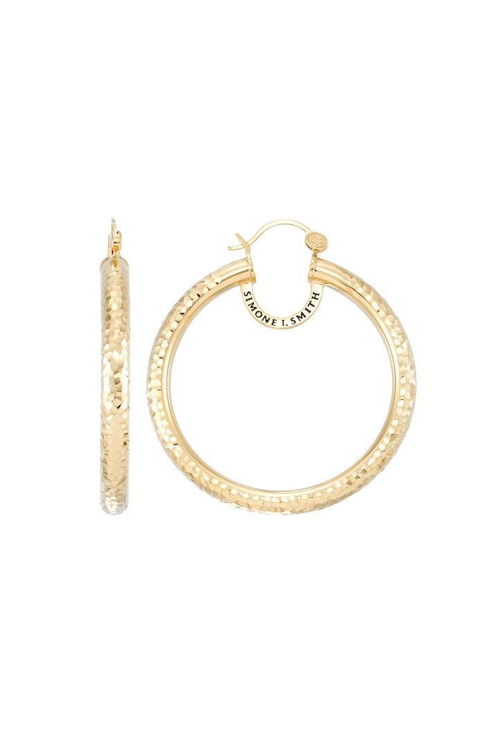 These Rocky Road Hoops by Simone I. Smith: These large hoop earrings in 18kt yellow gold over sterling silver feature a rugged design, embodying strength and resilience. Their bold presence and textured finish make them a standout accessory, perfect for the confident individual. Whether for a casual outing or a more formal event, these hoops add a touch of flair to any ensemble.