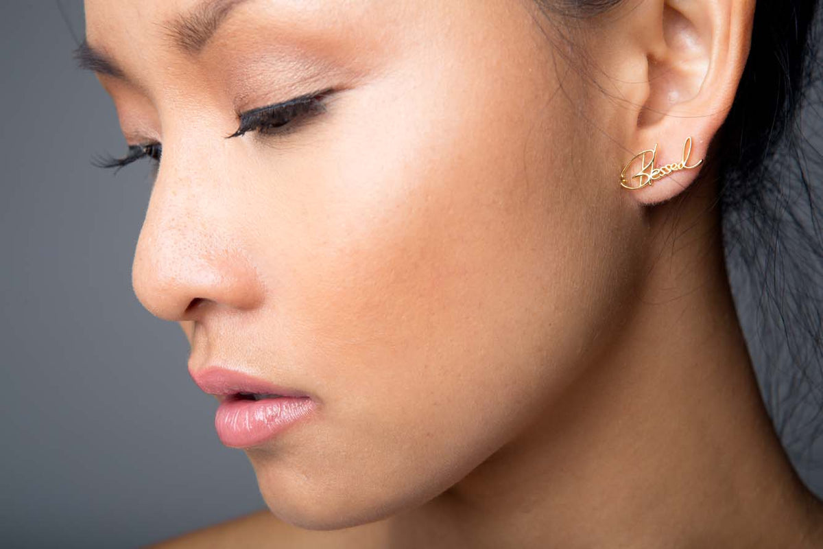 These Blessed Nameplate Studs by Simone I. Smith: These beautiful nameplate stud earrings are crafted in 18kt yellow gold over sterling silver, elegantly showcasing the word 'Blessed.' Their timeless design makes them a meaningful piece that embodies positivity and gratitude. Perfect for everyday wear or as a thoughtful gift, these studs add a touch of charm to any outfit.