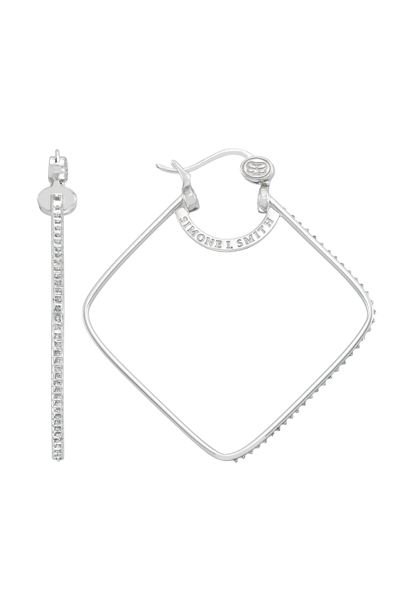 These Diamond Ice Hoops with Diamond Embellishments by Simone I. Smith: These large square-shaped hoops in platinum over sterling silver feature stunning diamond embellishments that sparkle with every movement. Their luxurious design symbolizes elegance and sophistication, making them perfect for special occasions or a glamorous night out.