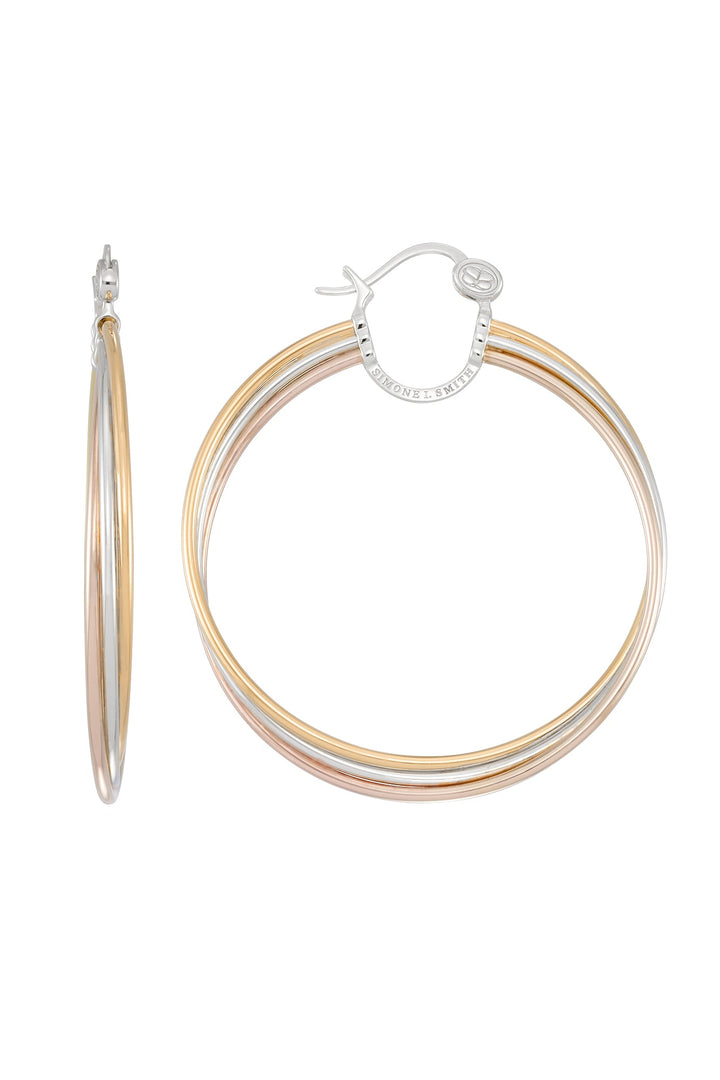 These The Trinities by Simone I. Smith: These large hoops feature a beautiful blend of 18kt yellow gold, rose gold, and platinum over sterling silver in a three-row design. The combination of metals symbolizes unity and diversity, making them a striking statement piece. Perfect for showcasing your unique style, these hoops can elevate any look, from casual to chic.