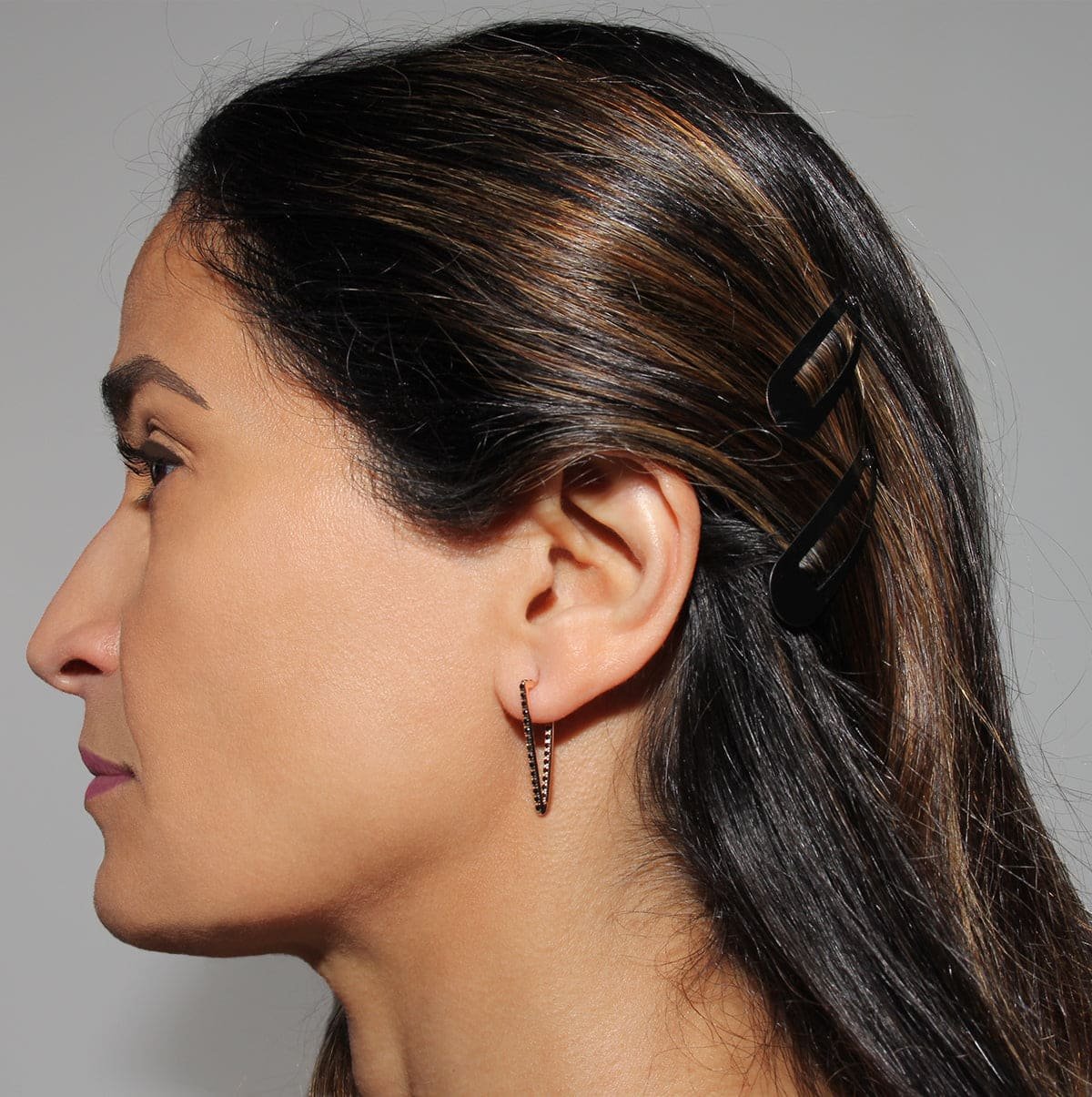 14k rose gold with 0.5ctw black diamonds, Grade A. Dimensions: 1 inch.